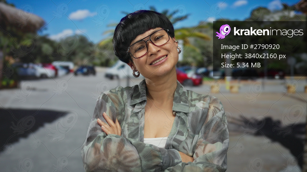 Woman smiling in outdoor city setting with trees and vehicles in background during daylight, wearing casual floral attire and glasses, embodying modern urban lifestyle. - Kraken Images