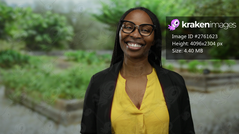 Woman smiling in outdoor park setting with greenery, wearing glasses and yellow shirt, exudes happiness and confidence in natural light.