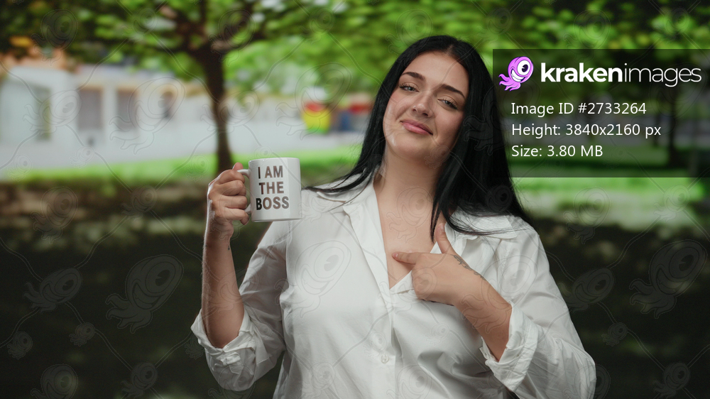 Woman smiling in park with curvy figure holding mug reading boss while pointing at herself during sunny day in outdoor setting with vibrant green trees and casual attire. - Kraken Images