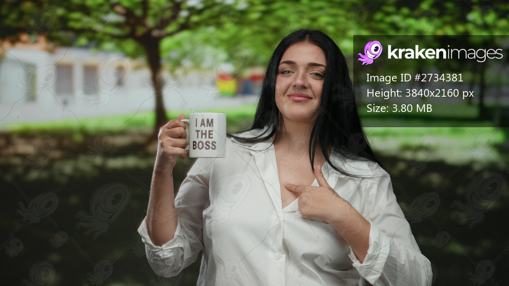 Woman smiling in park with curvy figure holding mug reading boss while pointing at herself during sunny day in outdoor setting with vibrant green trees and casual attire. - Kraken Images