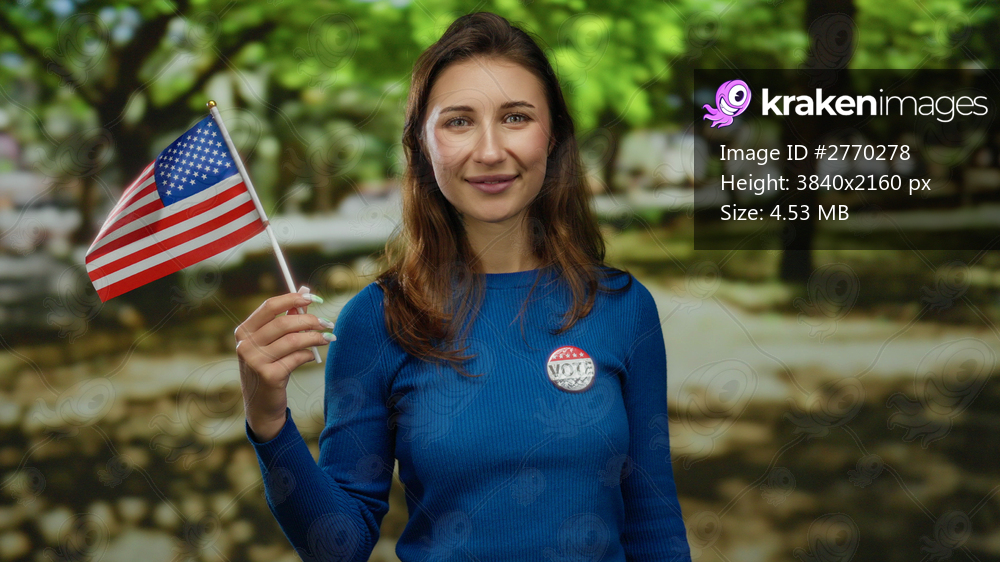 Woman smiling in park holding american flag wearing vote badge patriotic united states outdoors during election campaign day.