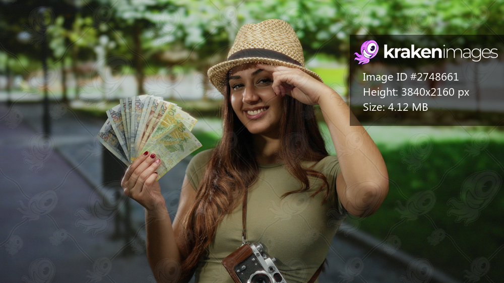 Woman smiling in park holding peruvian soles wearing a straw hat with a vintage camera, capturing vibrant outdoor scene with a playful gesture.