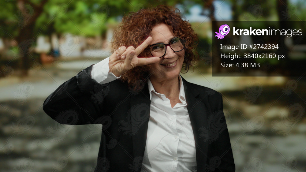 Woman smiling in park, wearing glasses and blazer, making peace sign with curly brunette hair under green trees on sunny day, showcasing confident and joyful demeanor outdoors. - Kraken Images