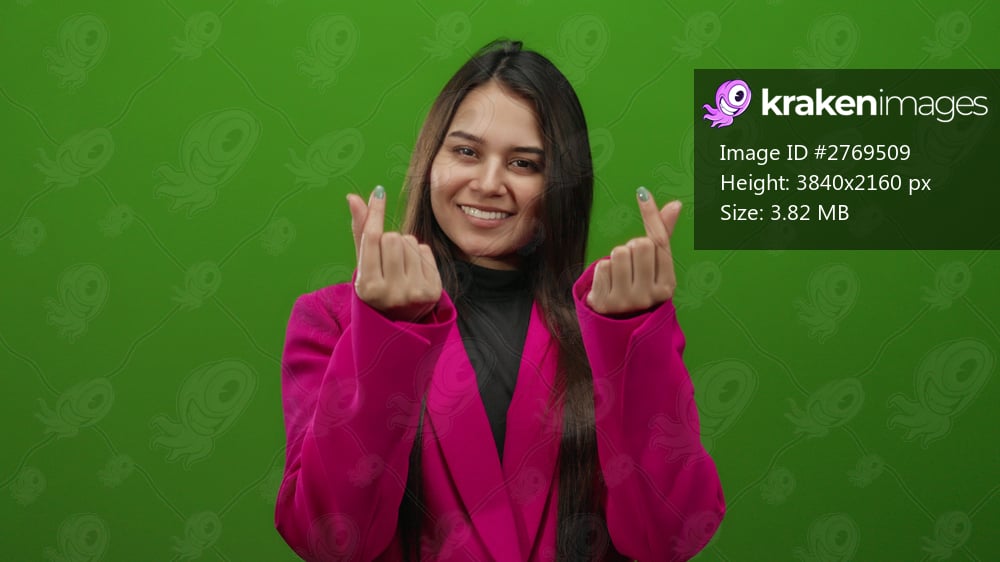Woman smiling in pink blazer making finger heart gesture against vibrant green background