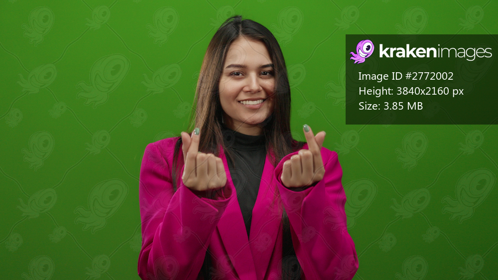 Woman smiling in pink blazer making finger heart gesture against vibrant green background