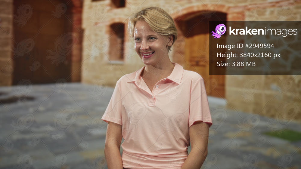 Woman smiling in pink polo shirt with short blond hair standing relaxed in front of stone building; calm contentment.
