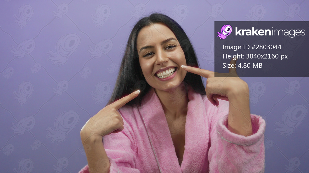 Woman smiling in pink robe against purple wall isolated background showing her teeth with hands pointing at mouth showcasing youthful energy beauty and confidence - Kraken Images