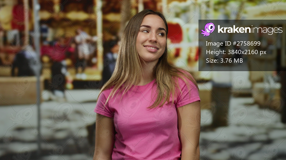 Woman smiling in pink shirt covering face with hands on sunny street with carousel in background