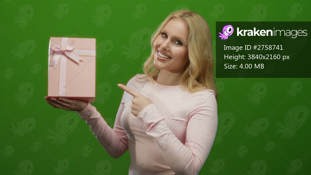 Woman smiling in pink shirt holds and points at a pink gift box with ribbon against a vibrant green background