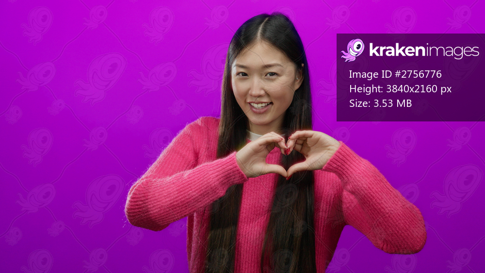 Woman smiling in pink sweater making heart shape with hands against a vibrant pink wall conveying love and positivity, featuring young, asian, female, isolated, expressive, adult, playful. - Kraken Images