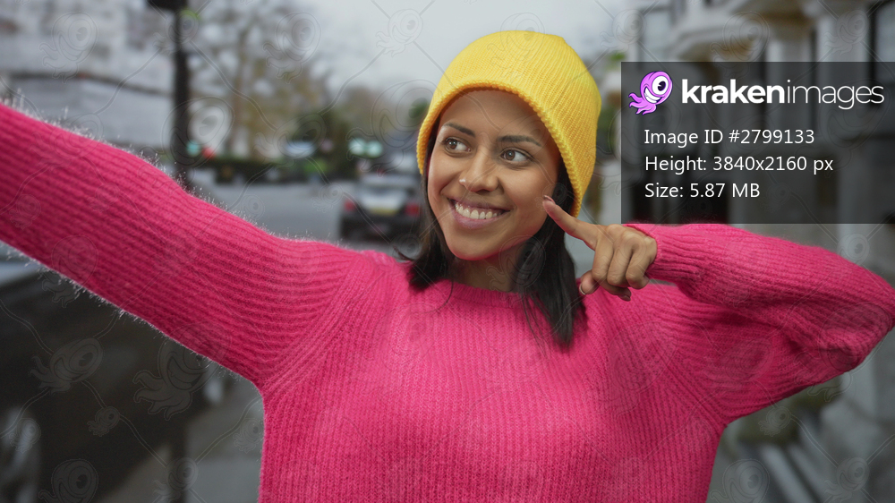 Woman smiling in pink sweater and yellow hat outdoors in urban street setting capturing joyful moment on a cloudy day while posing confidently.
