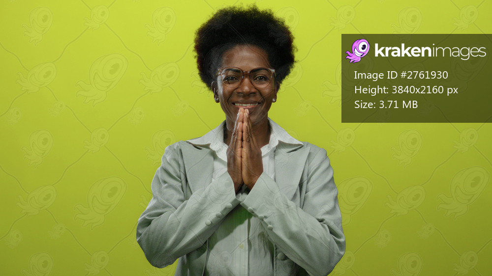 Woman smiling in prayer pose over isolated yellow background emphasizes peace, relaxation, spirituality, positivity, and mindfulness, embodying youthful tranquility and focus.
