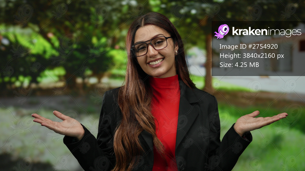 Woman smiling in red and black standing outdoors with hands open in a park, youthful expression, hispanic, wearing glasses, surrounded by greenery.