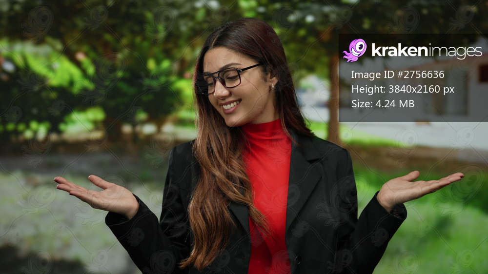 Woman smiling in red and black standing outdoors with hands open in a park, youthful expression, hispanic, wearing glasses, surrounded by greenery.