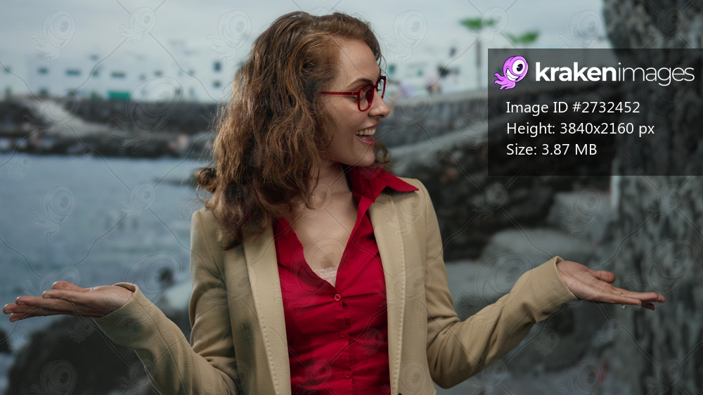 Woman smiling in red blouse and beige blazer by seaside resort with ocean view and rocky landscape, showing joy and relaxation at the beach.