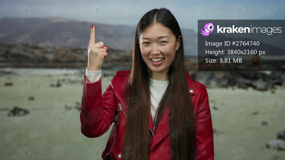 Woman smiling in red jacket on beach with mountains in background showcasing cheerful expression and pointing gesture under clear sky.
