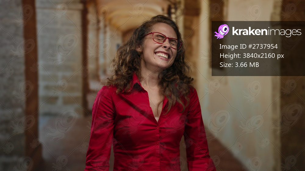 Woman smiling in red shirt with curly hair and glasses standing indoors at old university hallway.