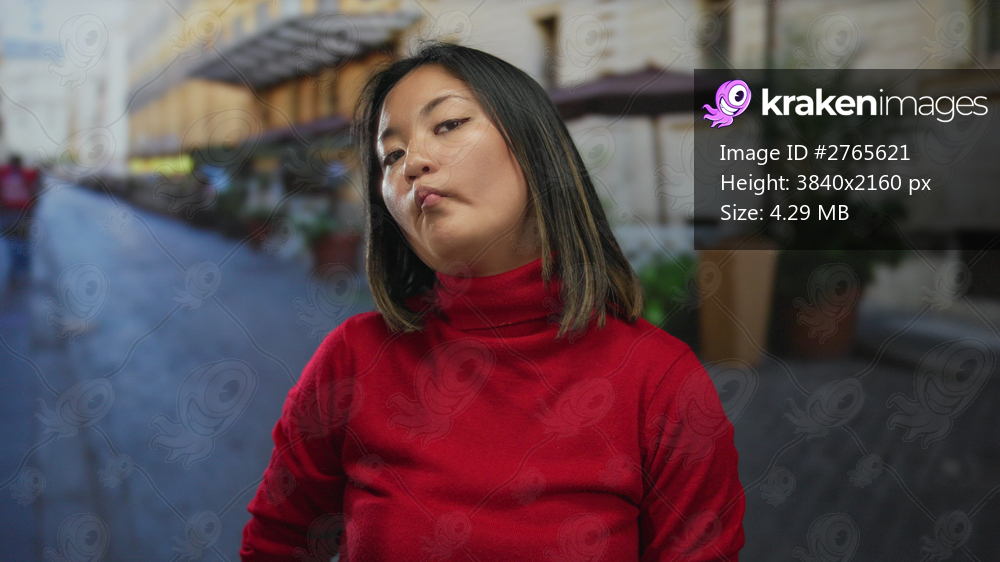 Woman smiling in red sweater on city street background showcasing urban outdoor lifestyle with youthful charm and vibrant energy.