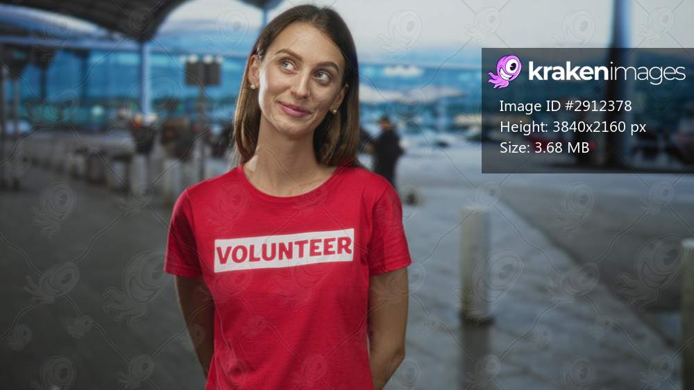 Woman smiling in red volunteer t shirt at airport terminal, hands behind back, face visible; community service friendly.