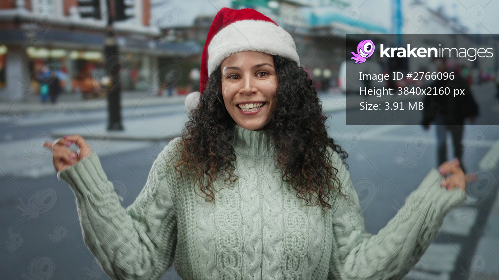 Woman smiling in santa hat and sweater outdoors on busy street pointing in multiple directions during festive season.