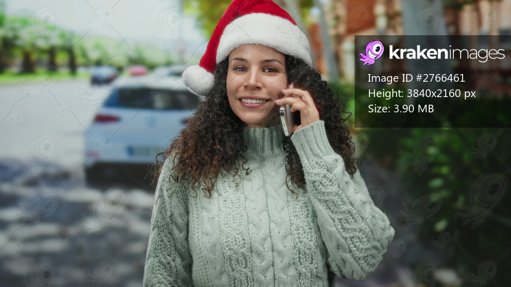 Woman smiling in santa hat using smartphone outdoors on urban street with green sweater amidst cars and trees celebrating christmas in public place expressing joy. - Kraken Images