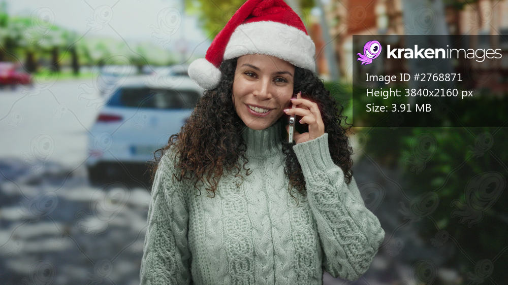 Woman smiling in santa hat using smartphone outdoors on urban street with green sweater amidst cars and trees celebrating christmas in public place expressing joy. - Kraken Images