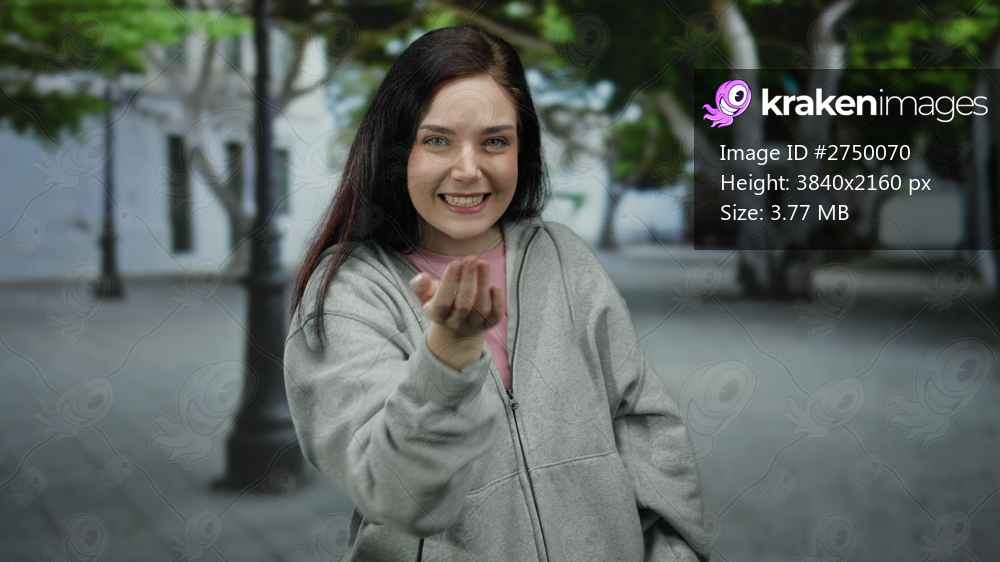Woman smiling in street of old town with brunette hair wearing a grey hoodie and pink shirt, surrounded by trees and urban scenery, showcasing casual outdoor lifestyle. - Kraken Images