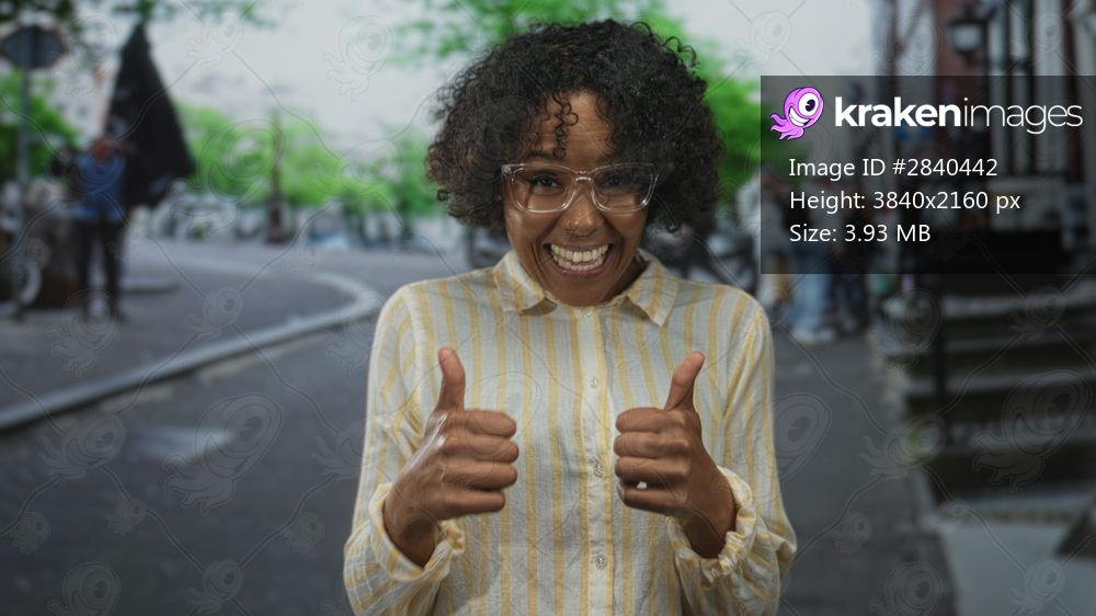 Woman smiling in striped shirt extends hand for handshake on bustling street; warm welcome friendliness camaraderie.
