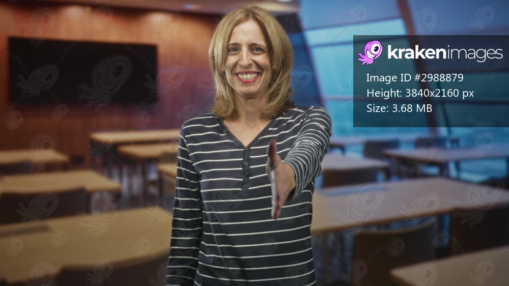 Woman smiling in striped shirt extends outstretched hand for handshake across classroom inside building; greeting welcome friendly.