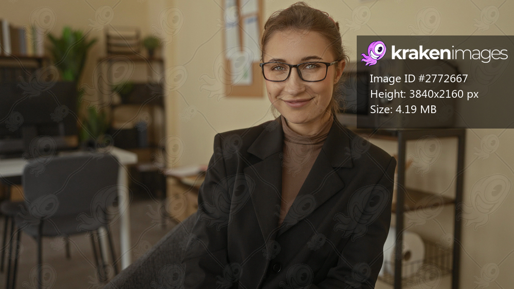 Woman smiling in stylish office setting with modern decor, capturing a confident business vibe in a professional indoor environment.