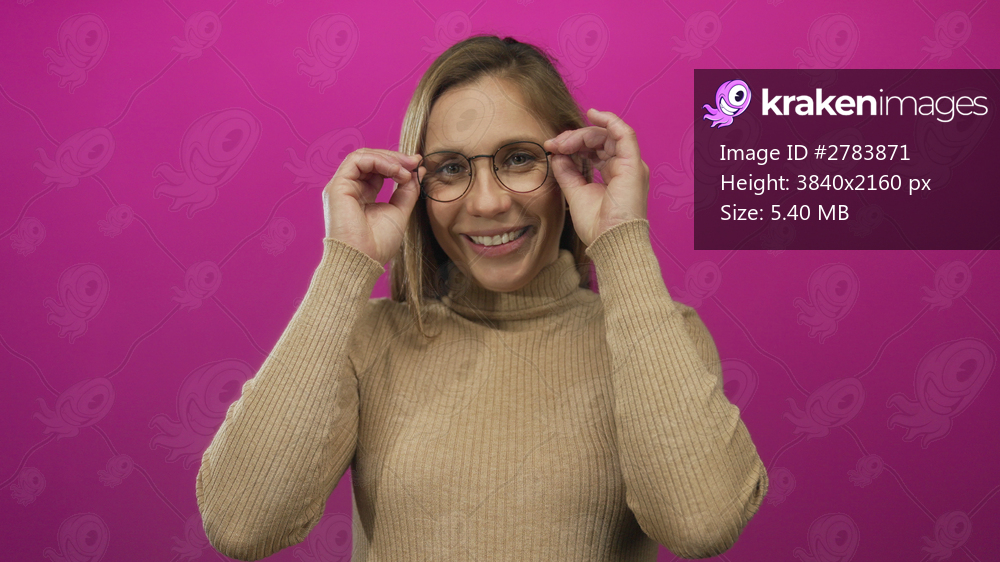 Woman smiling in turtleneck standing against vibrant pink background, adjusting glasses with joyful expression and relaxed posture depicting cheerful mood.