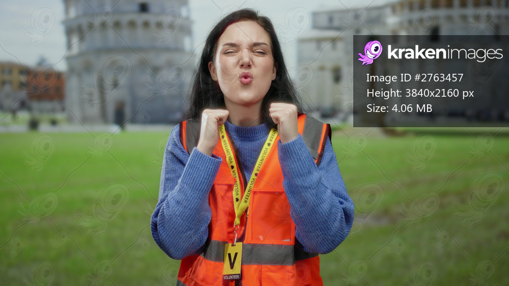Woman smiling in volunteer vest near pisa tower, italy, embodying joy against iconic background.