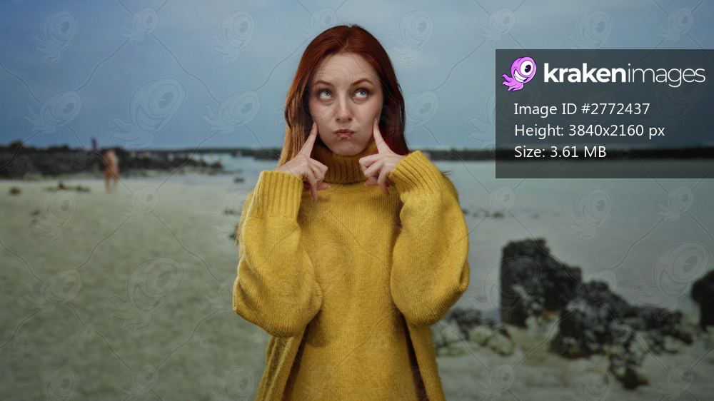 Woman smiling in warm sweater at scenic beach setting with rocks and sea under cloudy sky, showcasing beauty and happiness in outdoor seaside environment - Kraken Images