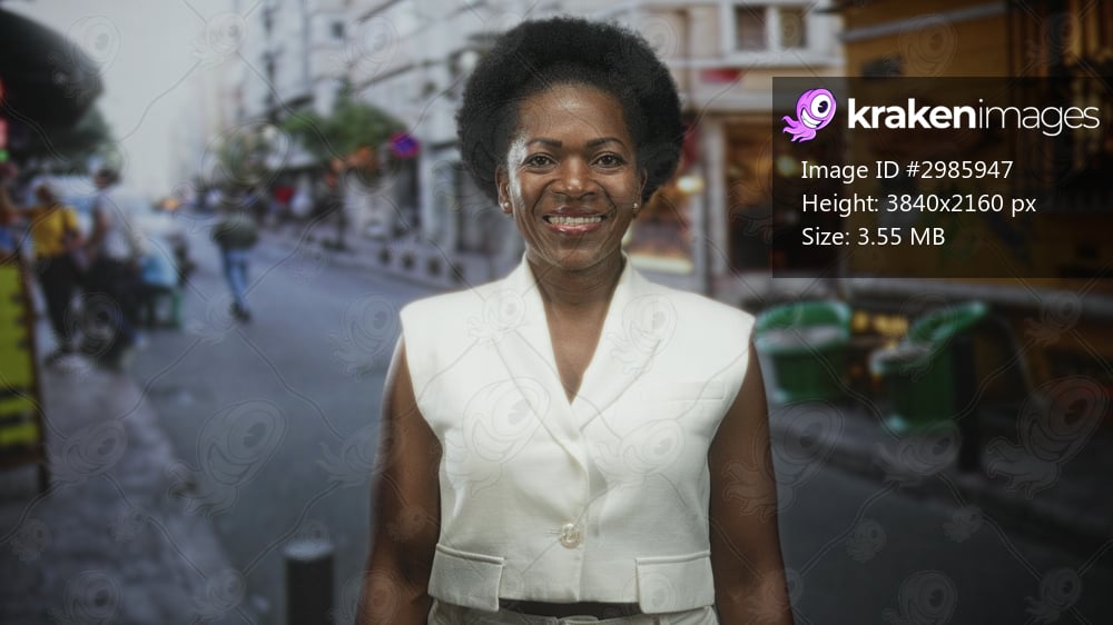 Woman smiling in white sleeveless vest standing centered on a busy street with green outdoor chairs and a bollard visible; urban confidence.