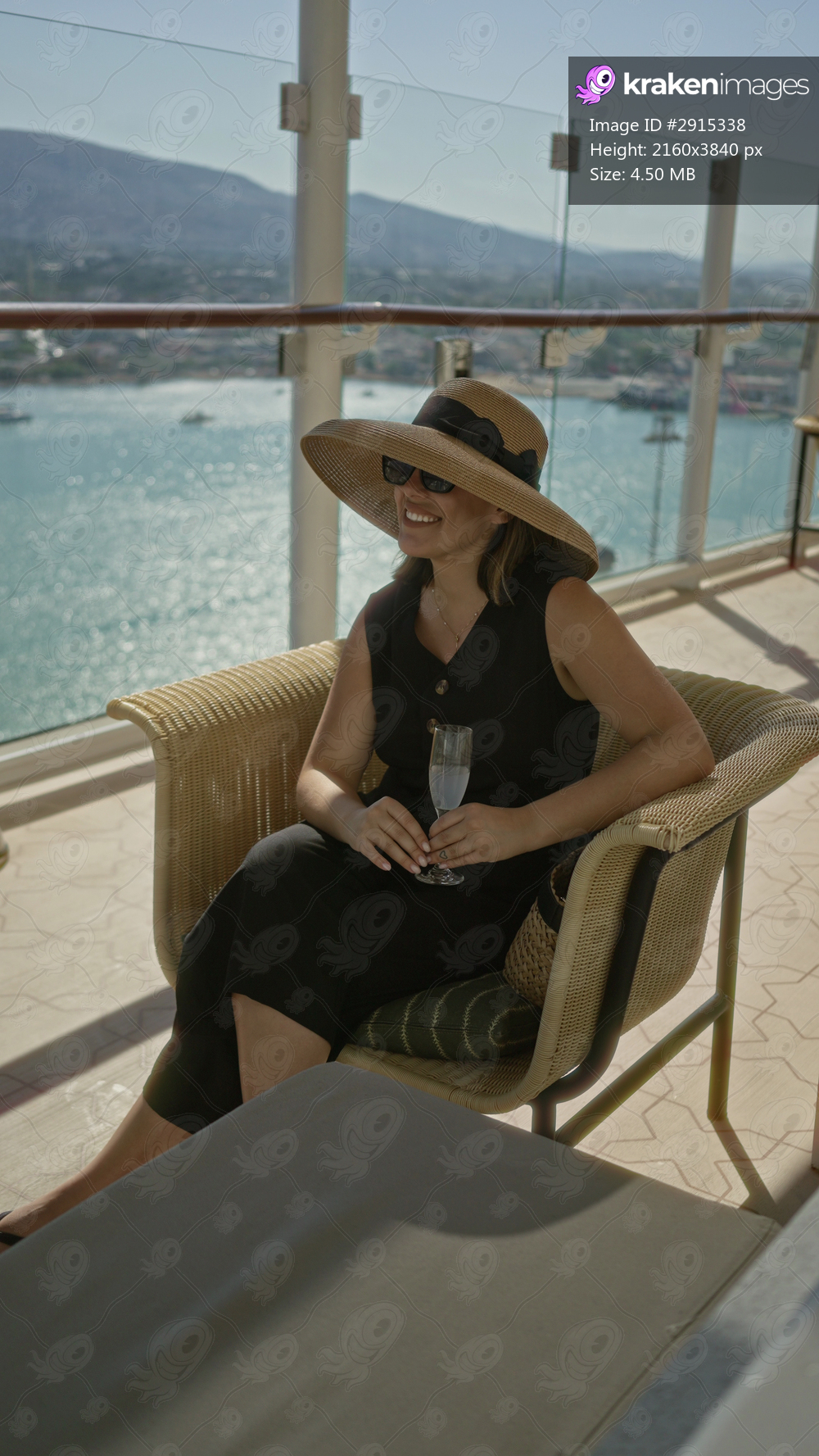 Woman smiling in wicker chair holding champagne glass and touching sunglasses while wearing wide sunhat on building terrace by the sea; relaxation.