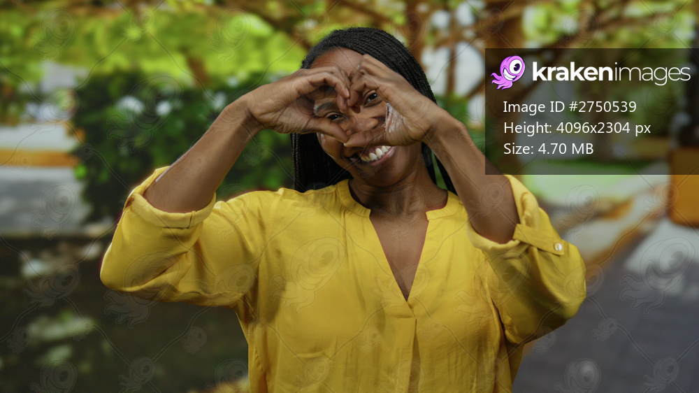 Woman smiling in yellow shirt making heart gesture outdoors in a green park setting with trees and sunlight in the background.