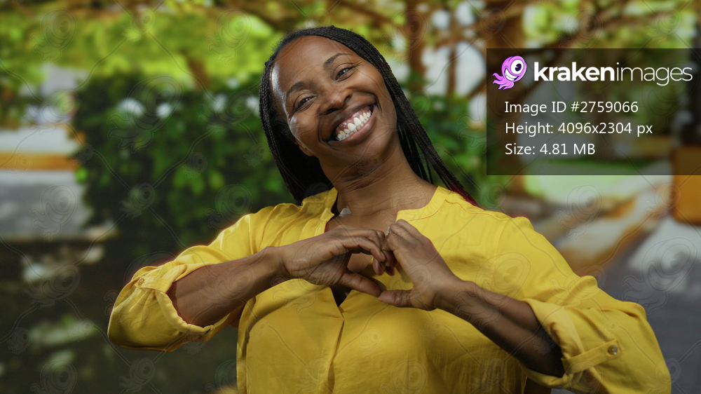Woman smiling in yellow shirt making heart gesture outdoors in a green park setting with trees and sunlight in the background.