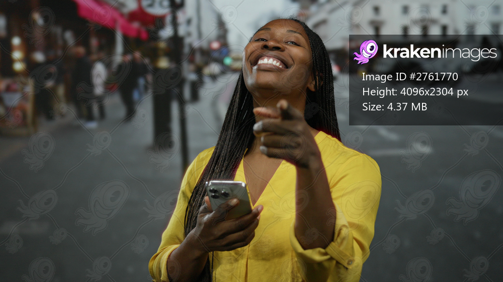 Woman smiling in yellow shirt pointing and holding phone in urban street setting with blurred background and diverse pedestrians.