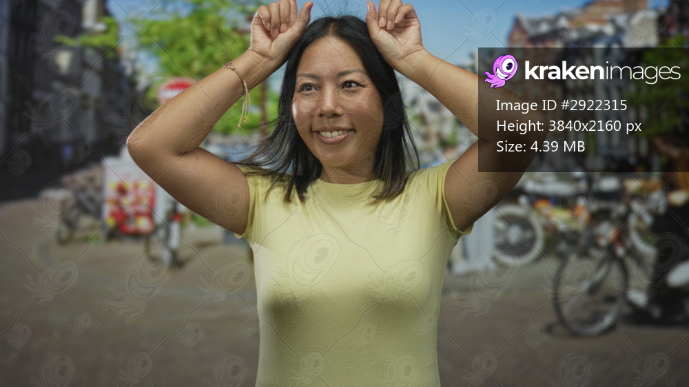 Woman smiling with index fingers to head on a busy street with bicycles and buildings, wearing yellow tshirt; playful confidence.