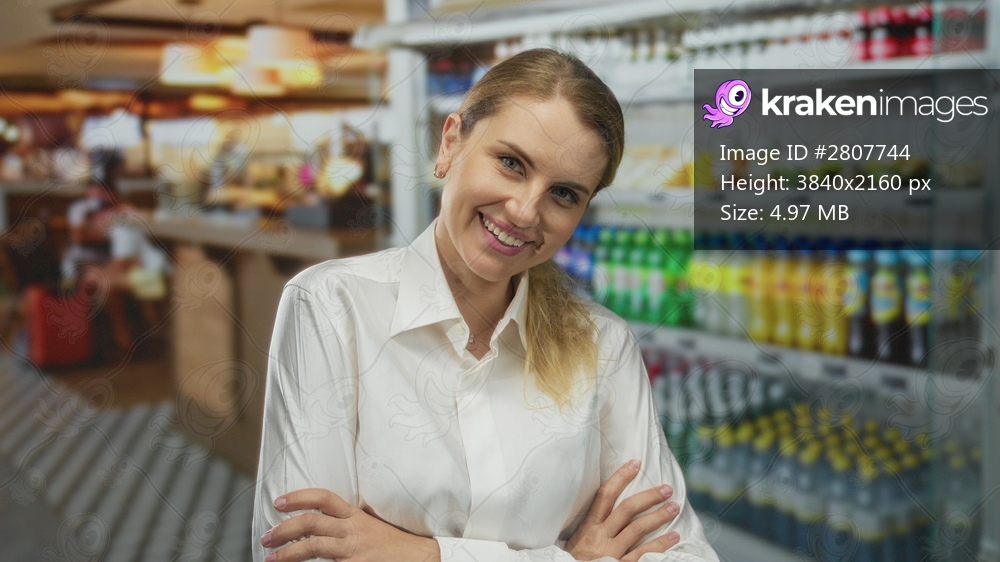 Woman smiling indoors with arms crossed wearing white shirt at a coffee shop with a beverage display in the background showing a cozy restaurant environment. - Kraken Images