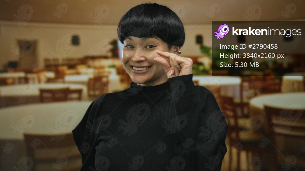 Woman smiling indoors at a coffee shop suggesting size with her fingers, creating a friendly atmosphere in a well-lit restaurant setting.