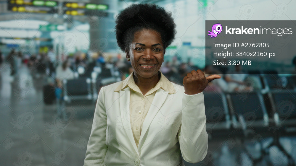 Woman smiling indoors at airport terminal pointing with thumb wearing white suit with blurred background of chairs and travelers suggesting travel readiness and business journey. - Kraken Images