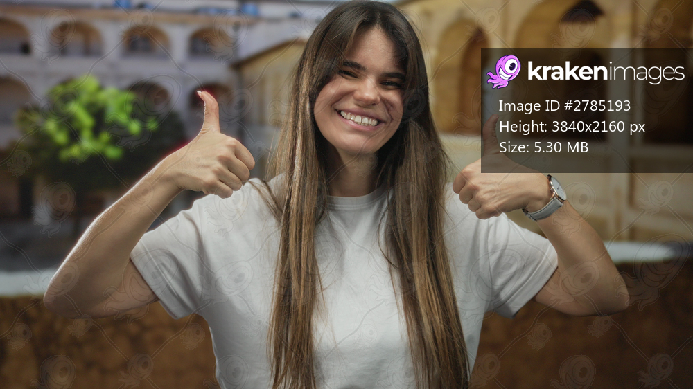 Woman smiling indoors at an old university setting with thumbs up and long hair, wearing a casual white shirt, conveying positivity and youth in a historic environment. - Kraken Images