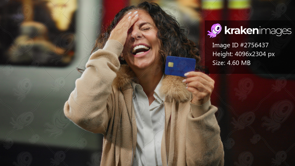 Woman smiling indoors at train station holding blue credit card against a blurred train background, capturing emotion and modern urban lifestyle.