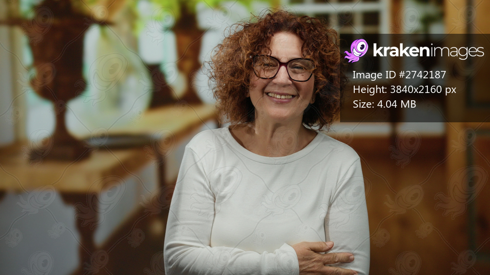 Woman smiling indoors with curly brunette hair wearing glasses in a warm hotel atmosphere showcasing relaxed and happy middle age confidence.
