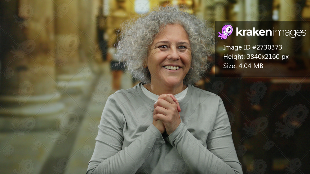 Woman smiling indoors with grey hair in a church setting exhibiting joyful expression amid ornate architecture representing mature wisdom and serenity. - Kraken Images