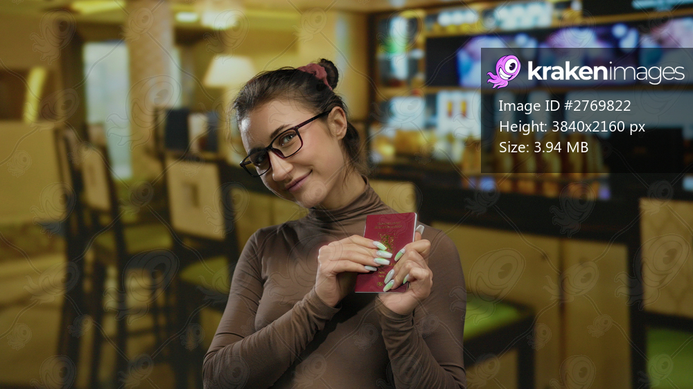 Woman smiling indoors holding finnish passport in a restaurant setting, highlighting travel readiness and international identity verification possibilities in a cozy environment. - Kraken Images