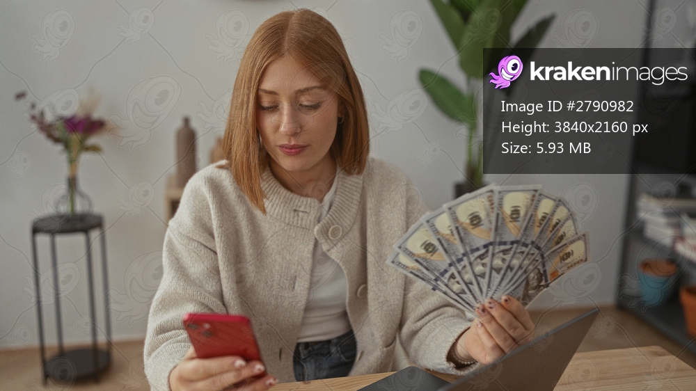 Woman smiling indoors holding phone and fan of us dollars next to laptop in cozy living room with plant in background.