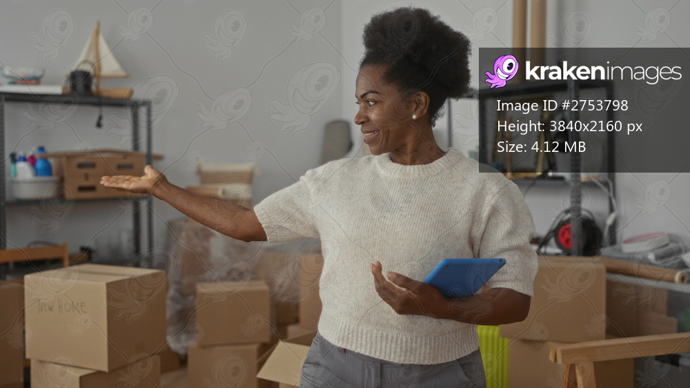 Woman smiling indoors holding tablet in new apartment surrounded by unpacked boxes and shelves, suggesting new beginnings and homeownership.