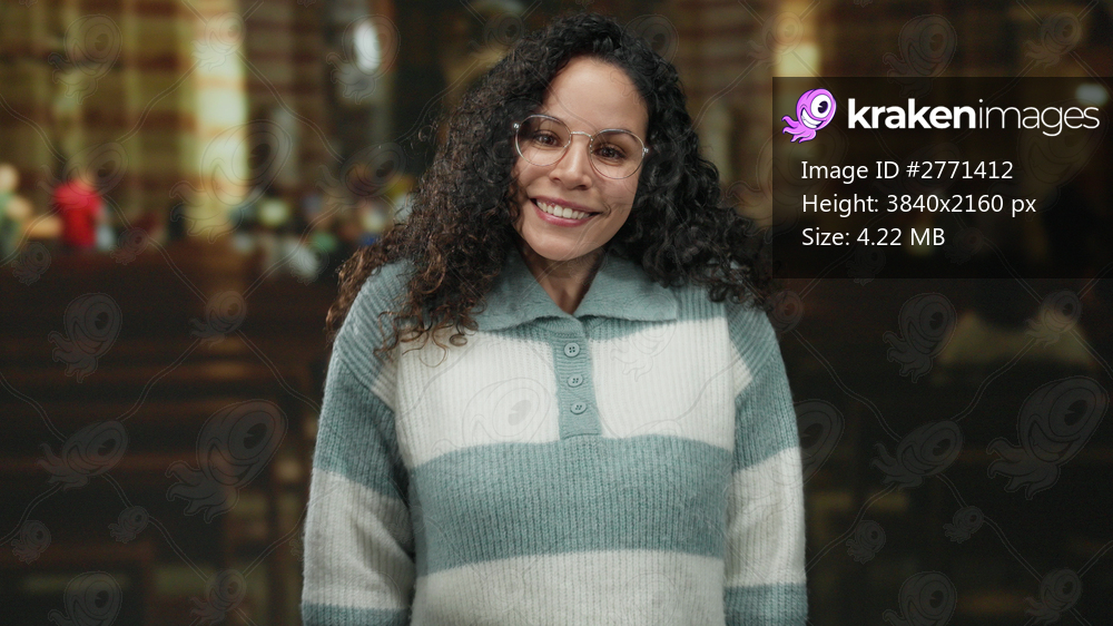 Woman smiling indoors in a church setting, depicting a young hispanic lady in a peaceful religious environment during a serene moment of reflection.